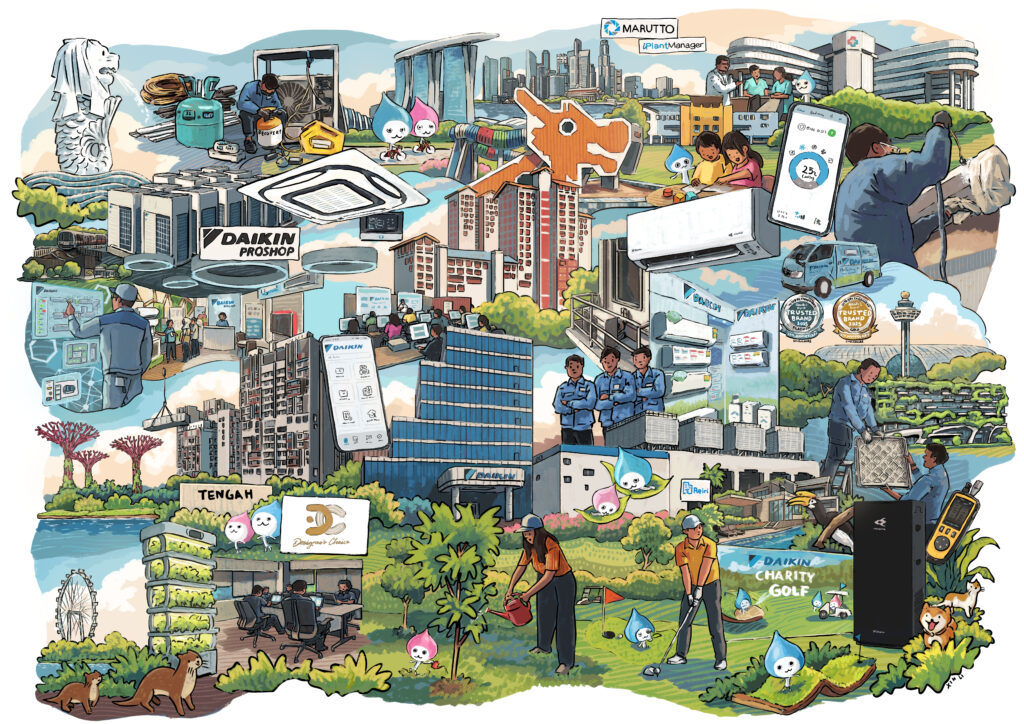 What does a cleaner, greener future look like? We collaborated with Singapore illustrator Lee Xin Li to bring that story to life in a special artwork inspired by Daikin’s mission – from reliable cooling and after-sales care to community and sustainability efforts. You’ll find this special illustration sprinkled across the pages of Daikin’s 2026 exclusive Diary and Calendar set.